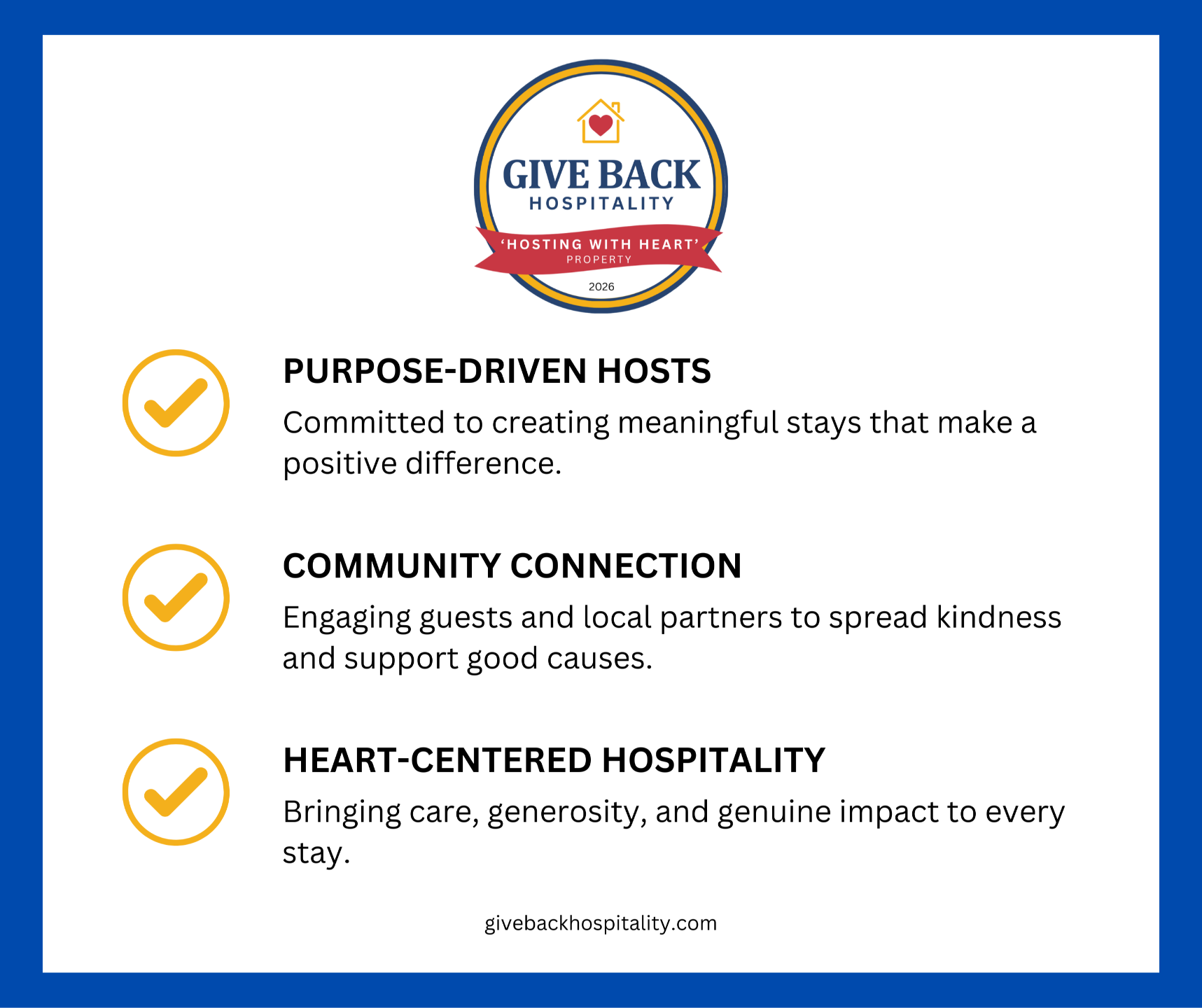 Our focus on community and purpose, helps hosts bring impact into their business while giving back together. With fresh ideas, shared resources, a Heart Stay Network, and the Hosting With Heart badge, we’re creating a movement where every stay has the power to make a difference.